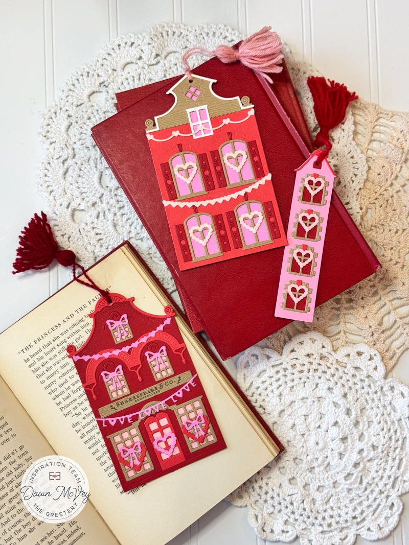 I used the previously released Market Place building dies to cut out the base layers and just had fun mixing all the pinks and reds. And then, I added a sign and all the Valentine-y layers using the new Market Place Lover’s Lane dies and stamp set.